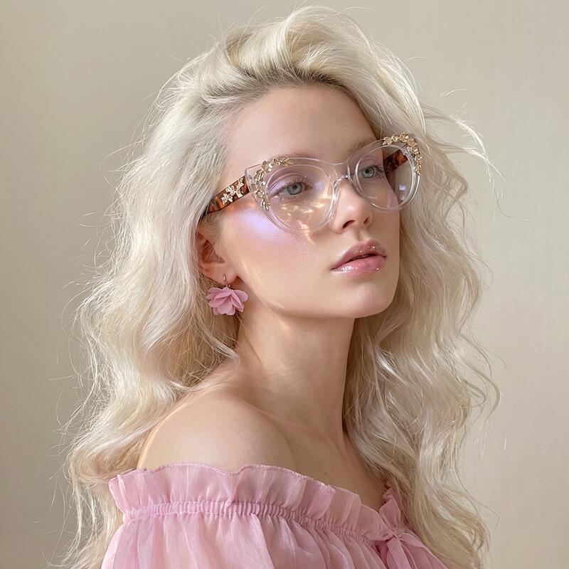 Try: Cat-eye, oval, and rimless frames. Anything with detail at the brow line — like a slight upsweep or a colored top bar — balances the narrow forehead. Avoid: Narrow rectangular frames that emphasize the cheekbone width.